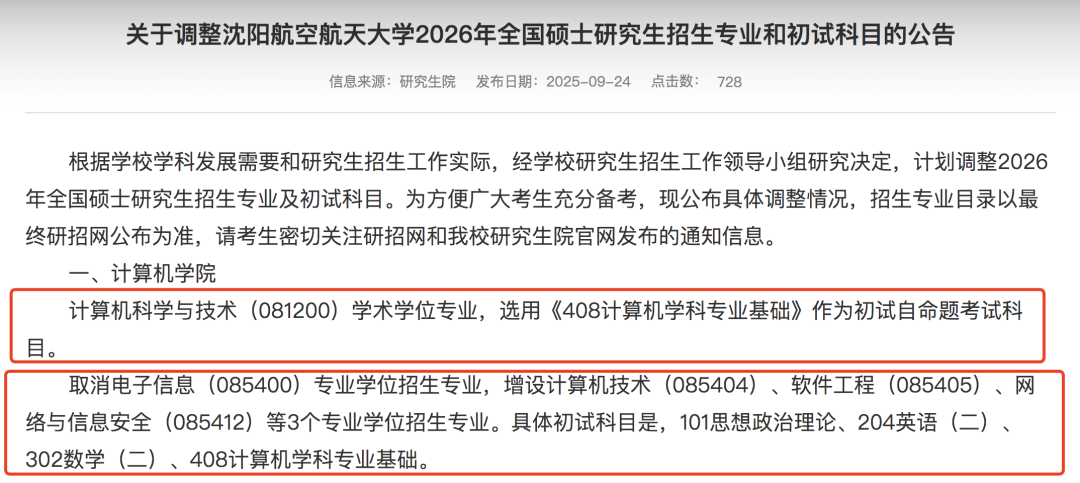 2.沈阳航空航天大学官宣26考研计算机学院改考408,人工智能学院未做调整,依旧自命题。